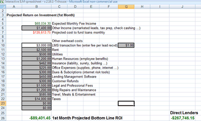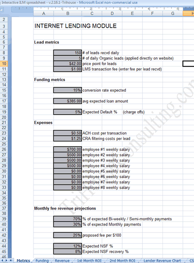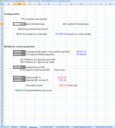 Payday Loan Industry > Biz Plan Excel Spreadsheet Internet Lender Excel Pro FormaEvery entrant to the payday loan industry needs our new "PDL Excel Spreadsheet Pro Forma." We had our analytics gurus build this tool. With it, you have the ability to "play" with multiple inputs including lead costs, default rates, loan conversion rates, number of loans funded daily/monthly, average loan principal amount, fee charge per loan principal, rollovers, employee costs, overhead expenses... We provide a solid foundation with which you can start. Then, you change the variables based on your "secret sauce." We guarantee our "Payday Loan Pro Forma Excel Spreadsheet" will blow you away with its power to enable your Team to "see into the future." There is nothing like this tool on the market today. We've invested our 20+ years of payday loan knowledge and experience as a Lender in this tool. You simply cannot get access to anything like this tool unless you bring serious payday loan experience and Excel experts to the "game." Invest in it now! It's the 6th item offered on this page. Screen Shots